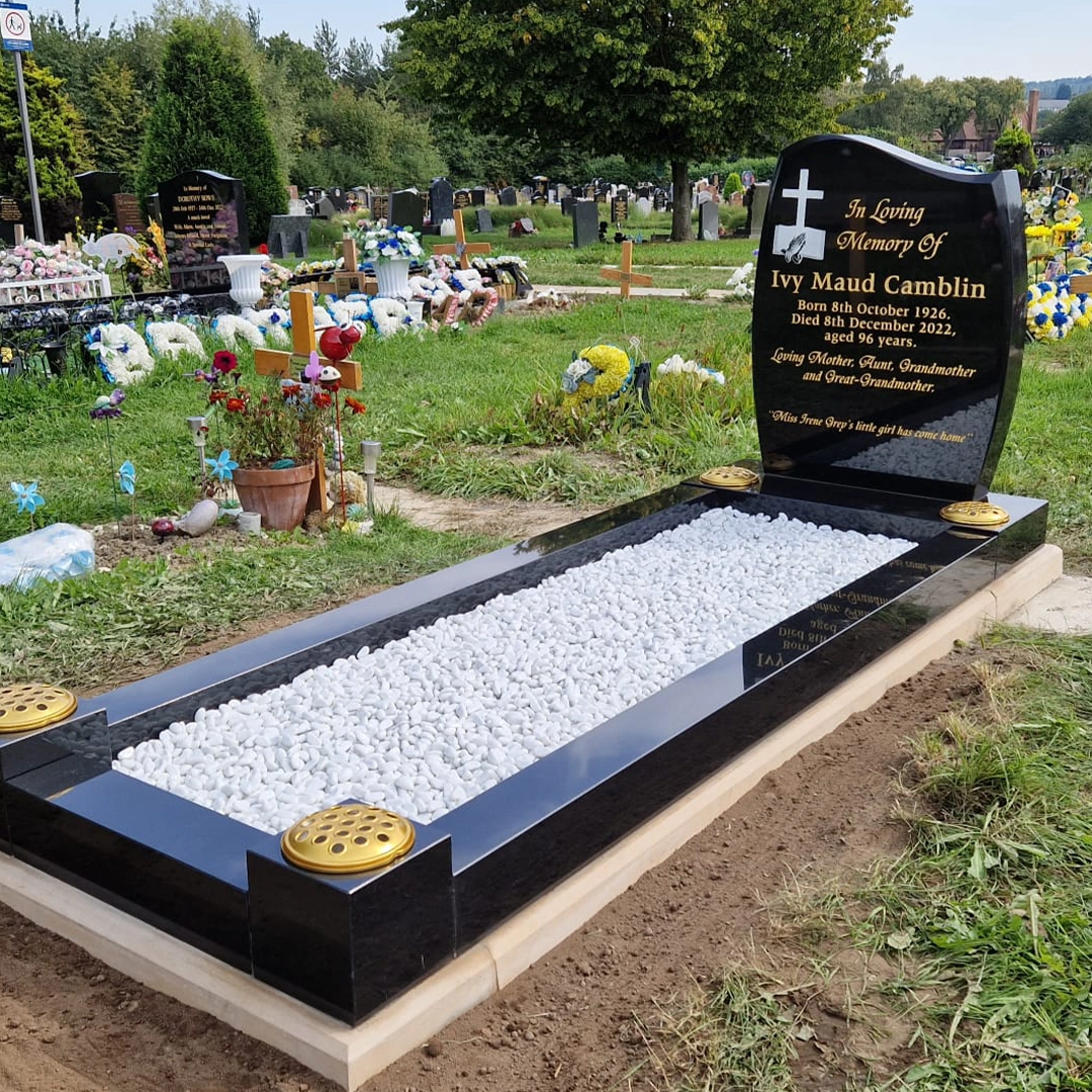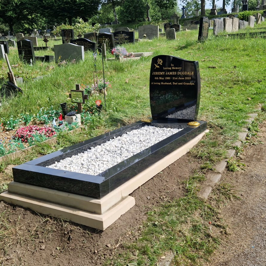 The Anton Headstone with Full Length Surround is a refined and elegant memorial design, combining gentle curves with a strong, balanced presence. The softly shaped headstone offers a classic silhouette, while the full length surround creates a defined and orderly resting place, suitable for decorative stone infill and personal touches.