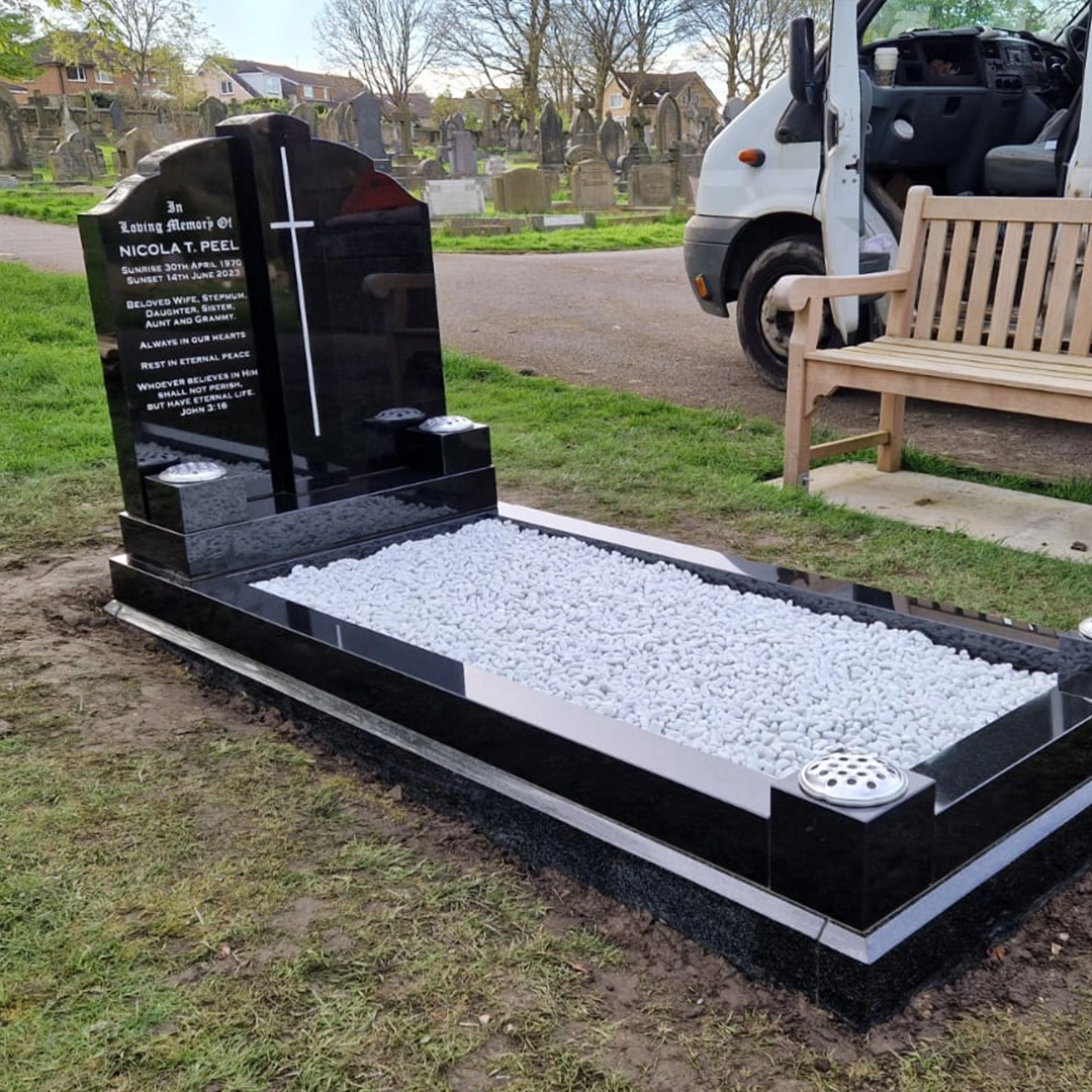 Shown here in polished black granite with a dark grey granite foundation and risers, this memorial combines timeless style with strength and durability. Crafted from high-quality granite, it is designed to withstand the elements while maintaining a refined, low-maintenance finish. The full surround allows for personalisation through inscriptions, motifs or choice of stone chippings, making each memorial truly individual.
