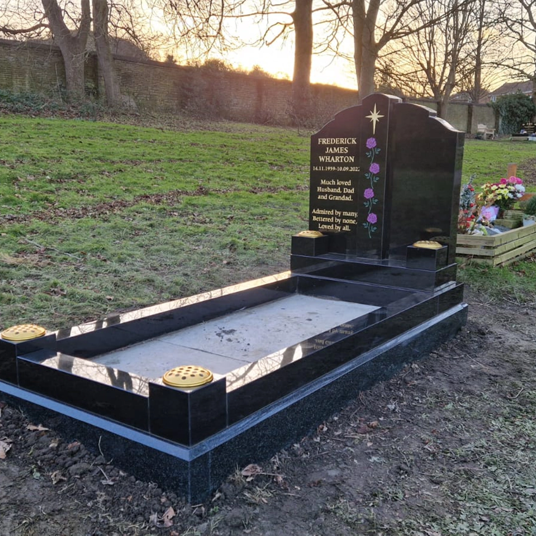 Shown here in polished black granite with a dark grey granite foundation and risers, this memorial combines timeless style with strength and durability. Crafted from high-quality granite, it is designed to withstand the elements while maintaining a refined, low-maintenance finish. The full surround allows for personalisation through inscriptions, motifs or choice of stone chippings, making each memorial truly individual.