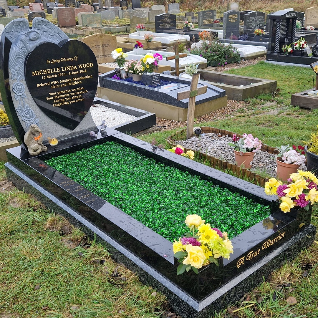 This memorial is crafted from premium granite and paired with a full length surround, creating a clean, structured frame for decorative stone infill, as shown here with coloured chippings. The combination of polished black granite with a contrasting dark grey granite foundation provides both visual depth and long-lasting durability. The design can be fully personalised with inscriptions, motifs and a choice of granite colours to suit individual preferences.